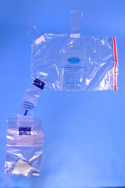 In this example, you can see how the Surgilav Irrigator is inserted into the watertight valve in the Treatment Bag for easy access to the wound area.