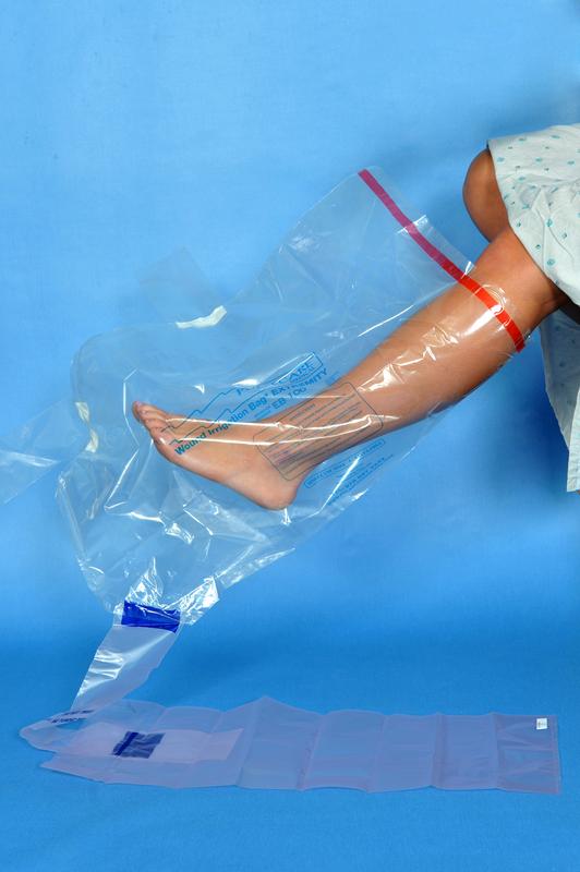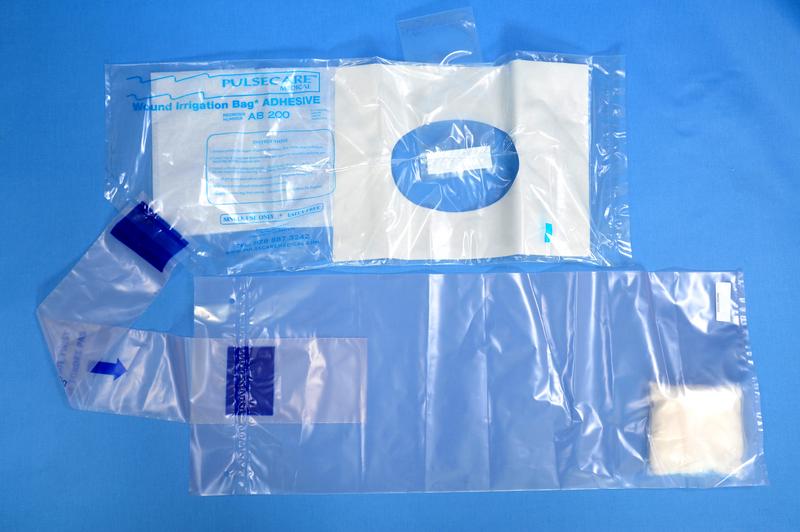 PulseCare wound irrigation bags are available in two styles: the “Trunk Adhesive Bagâ€? andÂ