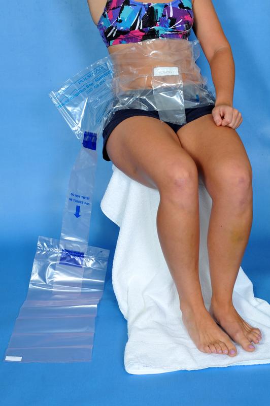Please note how the Collection Bag trails below the Treatment Bag, so it can collect contaminated fluid through the force of gravity. The Treatment Bag forms a watertight seal against the body.